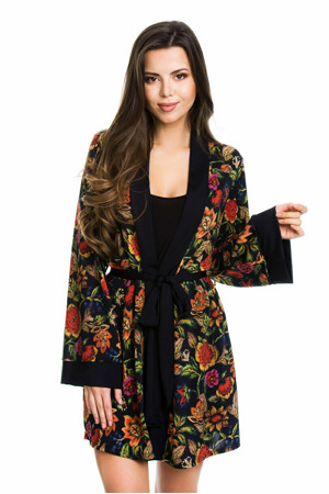 Dámský župan/kimono, který je vyrobený z velmi kvalitního vzorovaného materiálu. Model má široké rukávy. V pase se župan zavazuje černým páskem...