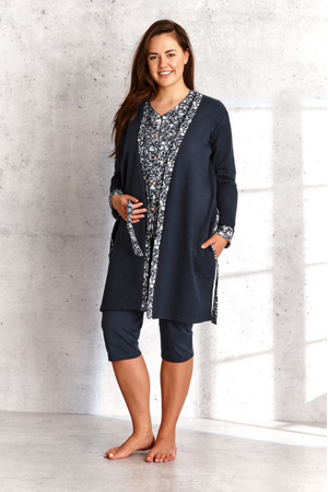 Dámský župan s dlouhými rukávy. Župan se v pase zavazuje. Rukávy a lemy modelu jsou obšité kontrastní lemovkou...