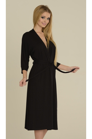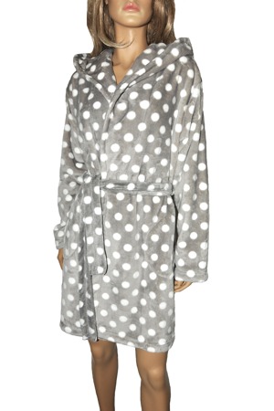 Krátký dámský župan, který je vyrobený z měkkého materiálu příjemného na dotyk. Župan má kapuci, dlouhé rukávy, dvě vnější kapsy a v pase se zavazuje. Rukávy a kapuce jsou ozdobené páskou s nápisem. Model má délku ke kolenům...