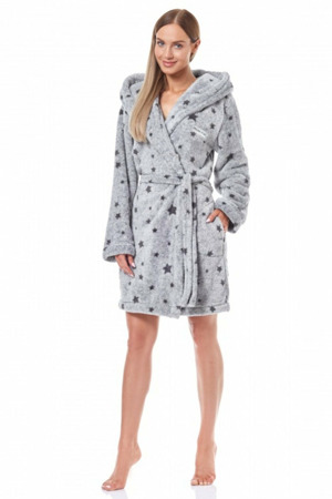 Dámský krátký župan 9135 L&L - světle šedá barva s tmavě šedými hvězdičkami - ušitý z měkkého materiálu typu soft - má kapsy a v pase vázání - s kapucí...