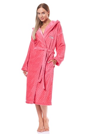 Dámský dlouhý župan 9144 L&L - tmavě růžová barva s jemnými puntíky - ušitý z měkkého materiálu typu soft - má kapsy a v pase na vázání - v oblasti prsou výšivka - rukávy s manžetami - s kapucí...