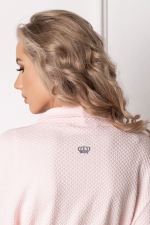 Pohodlný a komfortní dámský župan. Župan je vyrobený z bavlny s přídavkem pružných přízí a je ozdobený vytlačovaným vzorem. Model je krátký, má šálový límec a kapsy. Župan se v pase zavazuje. Na zádech má model jemnou výšivku s korunou. Složení: 55 % bavlna, 40 % polyester, 5 % spandex.