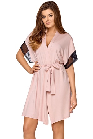 Velmi žensky působící dámský župan. Župan má krátké kimonové rukávy a výstřih ve tvaru písmene "V". Rukávy jsou olemované síťovinou s pěknými puntíky a jemnou krajkou. Model má pohodlný a komfortní střih a zavazuje se páskem. Župan je vyrobený z viskózové látky příjemné na dotyk. Složení: 94 % viskóza, 6 % elastan.