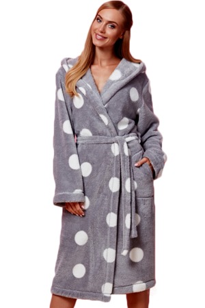 Klasický dámský dlouhý župan Darcy L&L - v grafitové barvě s bílými puntíky - z hřejivého hebkého mikroplyše - župan s kapucí, který se zavazuje v pase na pásek - na bocích kapsy