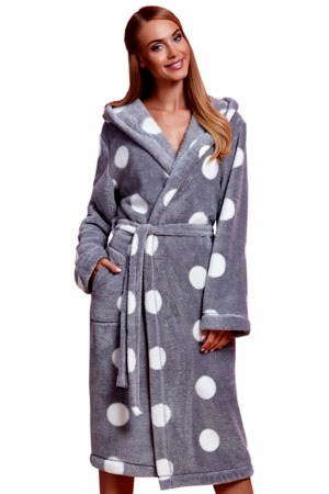 Klasický dámský dlouhý župan Darcy L&L - v grafitové barvě s bílými puntíky - z hřejivého hebkého mikroplyše - župan s kapucí, který se zavazuje v pase na pásek - na bocích kapsy