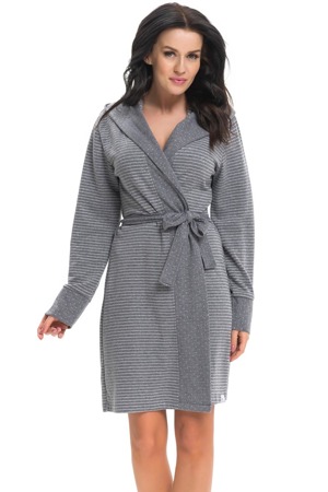 Pohodlný dámský župan v tmavě šedé barvě - s kapucí - dlouhé rukávy - v pase na zavázání - na bocích kapsy - jednoduchý střih - ušitý z kvalitního příjemného materiálu 60% bavlna, 35% polyester, 5% lurex