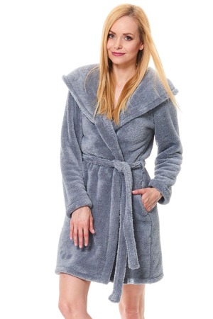 Komfortní dámský župan v šedé barvě z kolekce Doctor Nap. Župan má kapuci, která je ozdobená půvabným růžovým lemem. Přední díl modelu zdobí malá nášivka. Model má jednoduchý a pohodlný střih, dlouhé rukávy, na bocích kapsy a zavazuje se páskem. Župan je vyrobený z měkkého a velmi teplého materiálu příjemného na dotyk, který krásně zahaluje tělo. Složení: 100 % polyester. Modelka na fotografii je vysoká 165 cm.