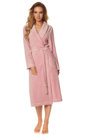 Příjemný dámský župan je zavinovací, má světle růžovou barvu a elegantní nášivky hvězdiček na límci...