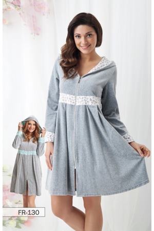 Velurový dámský župan s kapucí. Model se zapíná zipem. Župan se směrem dolů rozšiřuje.