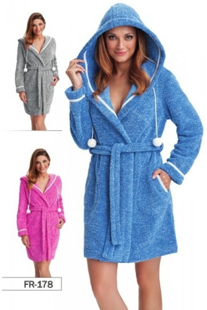Teplučký župan s kapucňou a krásnym doplnkom v podobe brmbolcov. Príjemný mäkký a teplý župan, dve bočné vrecká, dĺžka pod kolená (samozrejme podľa výšky dámy). Zloženie: 100% polyester