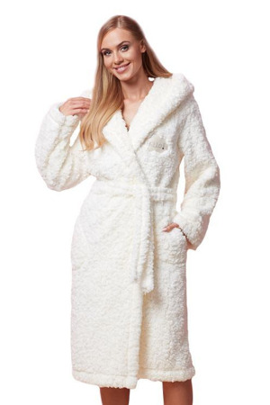 Dlouhý dámský huňatý župan v smetanově bílé barvě s výšivkou mráčku a nápisem Hello...