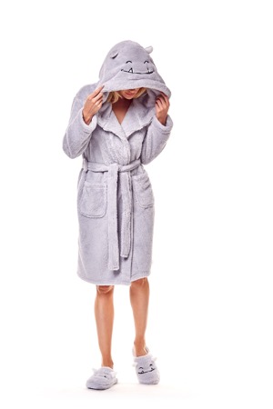 Pohodlný dámský župan ušitý z měkkého materiálu. Na kapuci jsou veselá ouška. V pase je na zavázání. Složení: 100% polyester