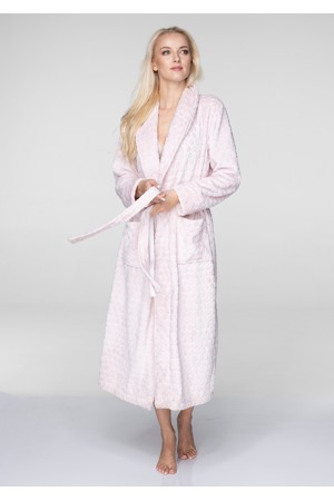 Jemný dámský župan. Župan je vyrobený z měkké a příjemné tkaniny a je ozdobený vytlačovaným vzorem. Model má šálový límec, na bocích kapsy a v pase se zavazuje. Délka modelu je pod kolena...