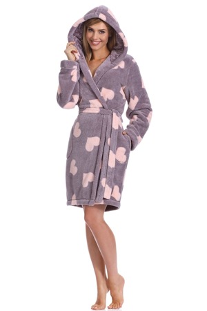 Dámský krátký župan Kola L&L - fialová barva s růžovými srdíčky - ušitý z měkkého materiálu typu soft - má kapsy a v pase na vázání - rukávy s manžetami - s kapucí...