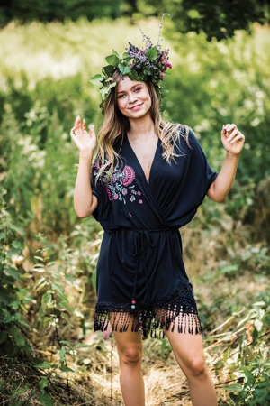 Víceúčelový krátký dámský přehoz přes oblečení/župan. Župan je vyrobený z měkké a lehké viskózové látky olemované třásněmi. Model zdobí folklórní aplikace v mnoha barvách. Složení: 95 % viskóza, 5 % elastan.