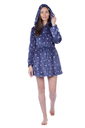 Dámský noční župánek do chladných zimních dnů. Huňatý a hřejivý kabátek má kapuci, v pase regulační šňůrku na utažení a boční skrytě všité kapsičky. Okraje rukávků jsou volně ukončeny. Délka sahá do půli stehen. Župan má design hvězdiček...