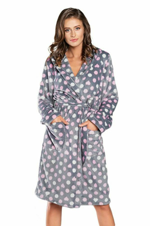 Pohodlný dámský župánek v elegantní šedé barvě s růžovými puntíky a srdíčky si rozhodně zamilujete...
