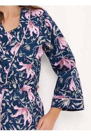 Dámský župan, který je vyrobený z tenké bavlny s květinovým motivem. Župan má 7/8 rukávy a v pase se zavazuje. Na bocích modelu jsou kapsy...