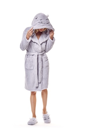 Dámský župan s kapucí a se zavazováním v pase. Složení: 100 % polyester. Krásný komplet je možné vytvořit s papučemi MIMI 36175.