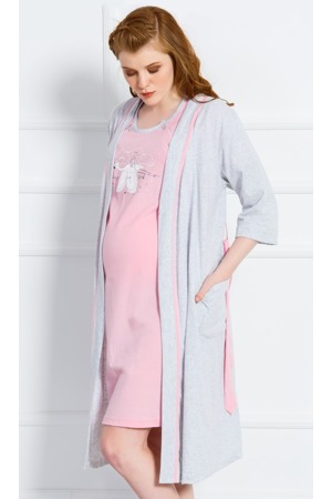 Dámský bavlněný župan krátký s mateřskou noční košilí Čáp. Noční košili zdobí potisk čápa. Košile je určená ke kojení, v oblasti prsou má otvory zapnuté na knoflíčky. Mateřská košile je díky volnějšímu střihu vhodná i v těhotenství a do porodnice. Župan má tříčtvrteční rukáv, zavazuje se páskem a na předním díle jsou našité dvě kapsy. Bavlněný materiál je poddajný a jemný na dotek. Dámský komplet je vhodný i na denní nošení.Materiály použité u tohoto výrobku jsou certifikovány, dosáhly nejvyšší možné kvality. Pokyny pro údržbu: - 70% bavlna, 30% polyester- lze prát v pračce při teplotě do 30°- nesušit v sušičce- žehlit z rubu do 110°- nepoužívat bělící prostředky- nečistit chemicky S výběrem správné velikosti by Vám měla pomoci tato tabulka: Mateřská sada košilka+ župan Velikost košilky S M L XL Obvod hrudníku 100 104 108 112 Délka košilky 96 97 98 99 Velikost županu Délka županu 104 105 106 107 Délka rukávu 59 60 62 63 Obvod hrudníku 106 112 118 124