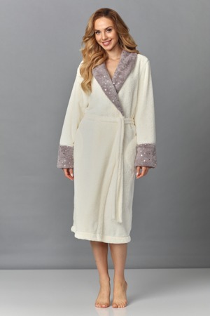 Komfortní dámský župan, který je vyrobený z teplé látky typu soft. Límec je ozdobený lesklými hvězdičkami. Model se zavazuje v pase. Délka županu je pod kolena.