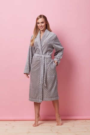 Dlouhý dámský župan s límcem. Župan je vyrobený z měkké a příjemné látky typu "soft". Přední díl modelu je ozdobený jemnou výšivkou. Župan má kapsy a zavazuje se v pase. Délka modelu je pod kolena. Složení: 100 % polyester.