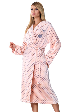 Dlouhý dámský župan s kapucí v lososové barvě s šedými puntíky. Složení: 100% polyester