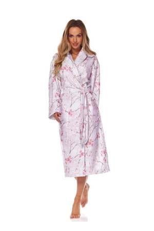 Dlouhý dámský župan se šálem. Župan je vyrobený z měkké vzorované tkaniny s přídavkem bambusu. Model má dlouhé rukávy, kapsy a v pase se zavazuje...