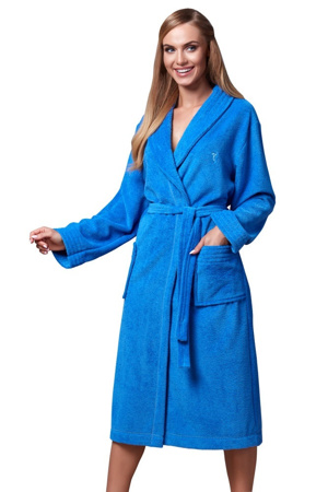 Dlouhý dámský župan v modré barvě s výšivkou ptáčka. Složení: 50% bambus, 50% polyester