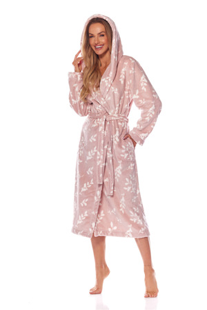 Dámský dlouhý župan s kapucí z měkké tkaniny. Kapsy na úrovni boků, zavazování v pase...