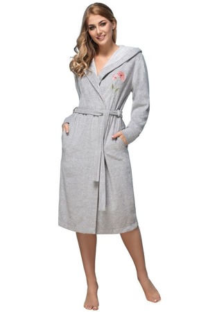 Bavlněný froté dámský župan ve světle šedé barvě s výšivkou máků. Složení: 96% bavlna, 4% polyester