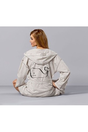 Krátký dámský melanžový župan s kapucí.Župan má délku nad kolena, zavazuje se v pase a je doplněný o praktické kapsičky. Zadní část je ozdobená jemným potiskem.Složení: 96 % bavlna, 4 % polyester.