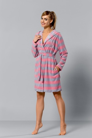 Krátký dámský župan s kapucí, který je vyrobený z tenkého veluru.Velur je pruhovaný, puntíkovaný (velké či malé puntíky), nebo jednobarevný. Na úrovni hrudníku je župan ozdobený aplikací. Tento model s kapsičkami se zavazuje v pase.Složení: 100 % polyester.