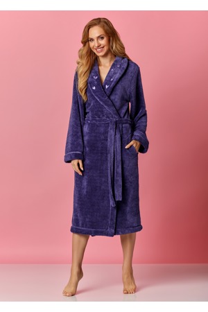 Dlouhý, pohodlný dámský župan ušitý z měkkého materiálu typu soft. Má šálový límec ozdobený srdíčky. Má kapsy a vázání v pase. Složení: 100% polyester