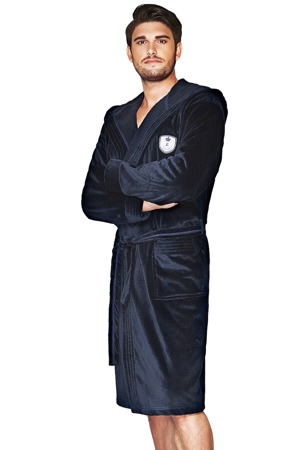 Pánský bavlněný župan v tmavě modré barvě s kapucí. Složení: 100% bavlna