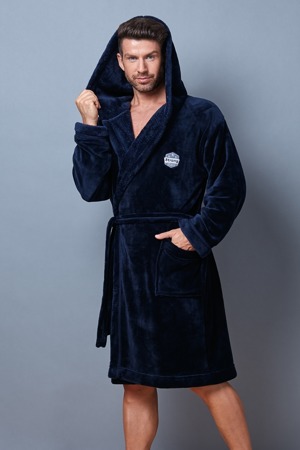 Pánský župan s kapucí 7105 L&L z příjemného mikroplyše - je vyrobený z měkké látky - model má na bocích kapsy a na hrudníku našitou aplikaci - je příjemný na dotyk a při nošení je velmi pohodlný