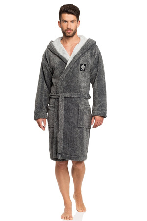 Dlouhý pánský župan s kapucí Bruce L& L - na zavazování kolem pasu - z měkkého úpletu (soft) - na bocích vnější kapsy - ve výšce hrudi nášivka - příjemný na dotek, garantuje komfort při nošení. Materiálové složení:100% Polyester