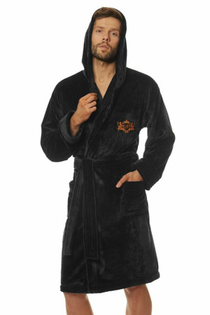 Hebký pánský župan Costa má elegantní černou barvu a je zdobený zlatou výšivkou se znakem...