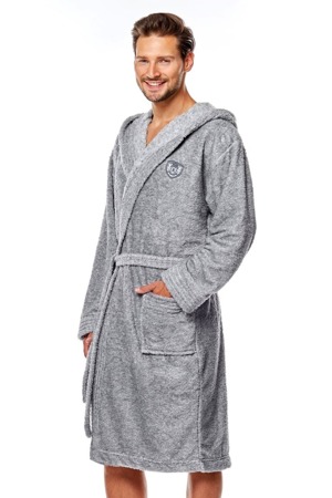Pánský župan s kapucí Iwo L&L z příjemného mikroplyše - ušitý z příjemného měkoučkého materiálu s krátkým hustým vlasem po obou stranách - po stranách jsou našité kapsy - zavazování je na pásek - ozdobná výšivka na levé straně - příjemný huňatý materiál, tvarově stálý