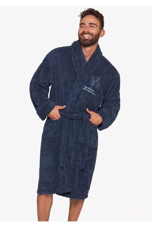 Pánský župan španělské značky Muydemi. Župan je vyrobený z oblíbeného froté materiálu. Okolo krku je dvojitý límec, který vyúsťuje na strany županu. Rukávy jsou na okrajích prošité. Na bocích má našité kapsy. Na levé straně je vyšitý vzor. Okolo pásu je prošitý opasek, který drží na poutkách...