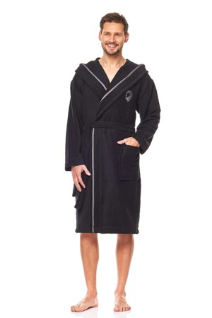 Pánský župan s kapucí, který je vyrobený z měkké froté tkaniny. Župan se v pase zavazuje. Model má na bocích vnější kapsy. Na hrudníku je ozdobná aplikace. Župan je měkký a příjemný na dotyk a při nošení je pohodlný a komfortní...