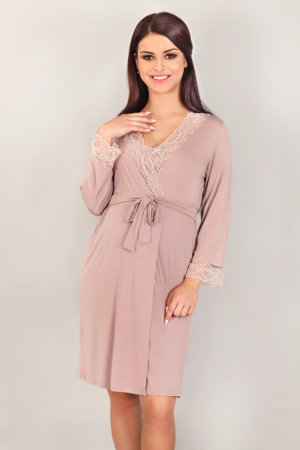 Miękki, wysokogatunkowy materiał, pięknie dopasowuje się do każdej wielkości brzuszka. Rękawki szlafroczka ozdobione piękną koronką. Szlafrok wiązany w pasie. Skład surowcowy: 70% Wiskoza, 20% Elastan, 10% Bawełna