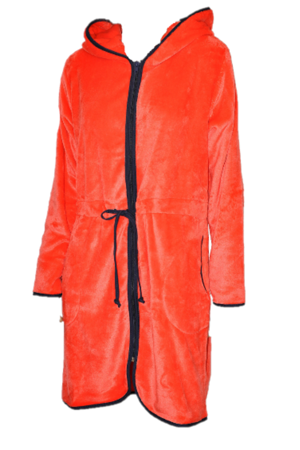 Krátký dámský župan Dobranocka s kapucí a zapínáním na zip. Vyroben z veluru, kapuce obšita barevnou, vzorovanou bavlnou. Ze 100% bavlny. Barva šedá melange ve dvou odstínech.