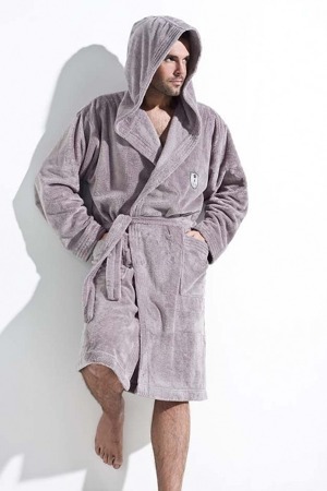 Pánský župan s kapucí, zavazování v pase, z měkkého materiálu (soft). Na bocích vnější kapsy, ve výšce hrudníku našitá aplikace. Velmi příjemný na dotek, zaručuje pohodlí během nošení.