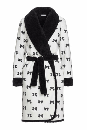 Dámský huňatý župan s délkou nad kolena. Župan má potisk černých mašliček na světlém základě. Materiál je příjemný, hřejivý plyš s delším vlasem po obou stranách. Župan má velký šálový límec a pásek na zavazování. Oblékněte si ho jako rituál odpočinku po koupeli nebo v něm prostě lenošte večer u televize.  Materiál 100% double fleece...
