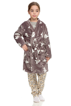 Teplý huňatý župánek s kapucí má dlouhé rukávy a je v pase na zavazování přiloženým páskem. Na předním díle jsou našité kapsy. Délka sahá do půlky lýtek. Materiálové složení: 100% polyester.